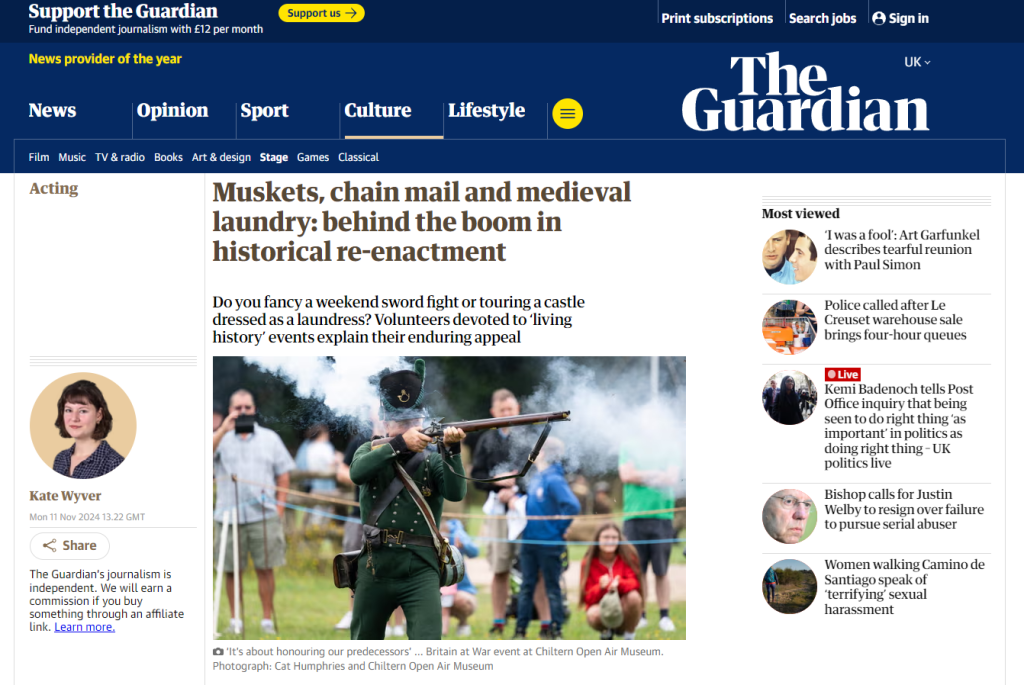 Since 2023 I’ve been the resident photographer for Chiltern Open Air Museum, photographing their living history events, costumed interpreters and volunteers at their 45 acre museum of historic buildings, traditional gardens and heritage farm in Buckinghamshire. This led to one of my images featuring in The Guardian.